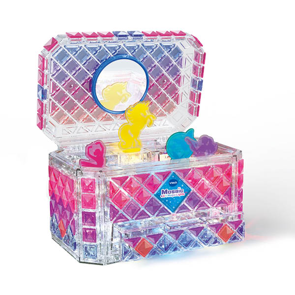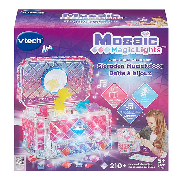 Laat je creativiteit de vrije loop met de Mosaic Magic Lights Sieraden Muziekdoos! Creëer je eigen unieke sieradendoos met meer dan 200 kleurrijke mozaïeksteentjes. Luister naar de mooie melodietjes en bekijk de prachtige lichteffecten. Met de herbruikbare mozaïeksteentjes maak je keer op keer een nieuwe creatie!