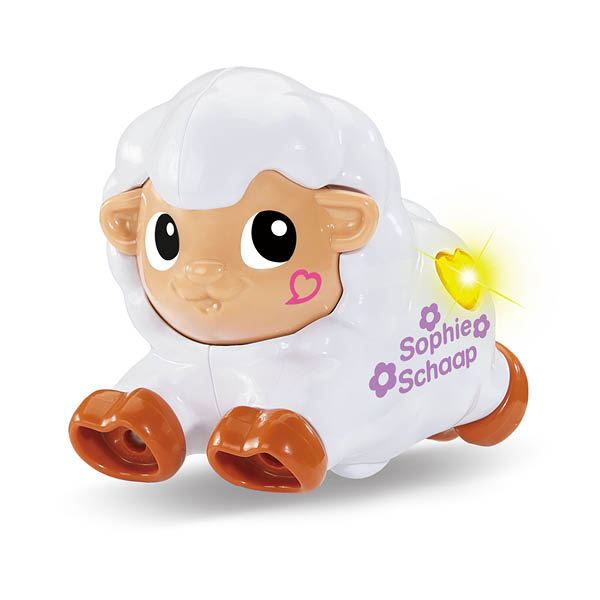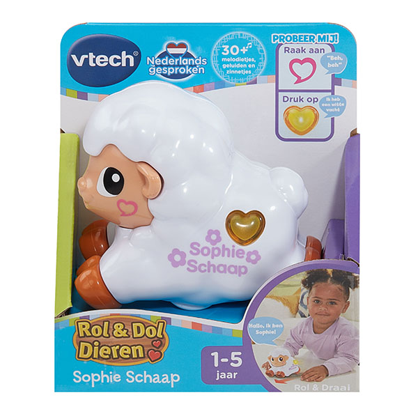 Ontdek de Rol & Dol Dieren en maak kennis met Sophie Schaap! Druk op het hartje voor leuke weetjes en raak haar wang aan voor een kusje, blaat of giechel. Laat Sophie vrolijk rollen en draaien over de grond, ze kan niet wachten om met jou te spelen!