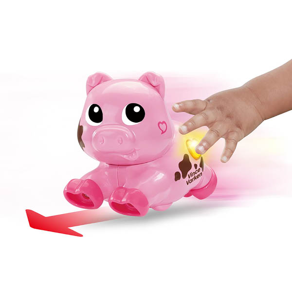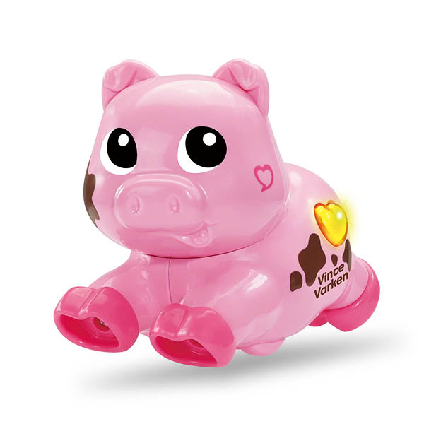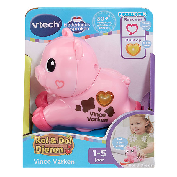 Ontdek de Rol & Dol Dieren en maak kennis met Vince Varken! Druk op het hartje voor leuke weetjes en raak zijn wang aan voor een kusje, knor of giechel. Laat Vince vrolijk rollen en draaien over de grond, hij kan niet wachten om met jou te spelen!