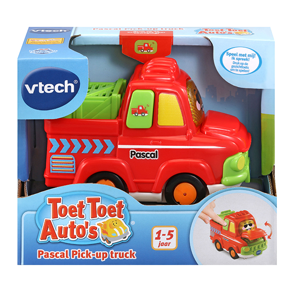Verzamel alle voertuigen uit de Toet Toet Auto's collectie! Druk op de knipperende gezicht-toets om geluidseffecten, vrolijke zinnetjes en gezongen liedjes te horen. Druk op de actie-toets om de motorkap te openen en grappige geluidjes te horen. Kom en ga samen met Pascal Pick-up truck de spullen bezorgen!