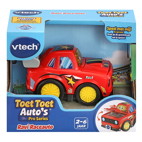 Het is tijd voor een nieuwe generatie Toet Toet Auto's! Verzamel ze allemaal! Druk op de knipperende gezicht-toets om geluidseffecten, vrolijke zinnetjes en gezongen liedjes te horen. Kom, laten we gaan racen met Ravi Raceauto!