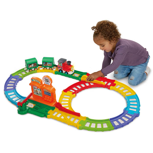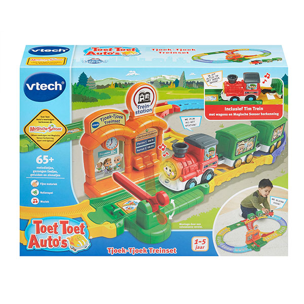 Beweeg Tim Trein met zijn wagons over het spoor en stop bij het station voor leuke reacties. Treinset inclusief 1 slagboom, 2 routewisselaars, 2 Magische Sensors en station.