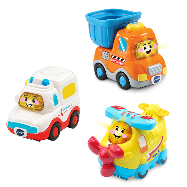 Druk op de knipperende gezichttoets om geluidseffecten, vrolijke zinnetjes en gezongen liedjes te horen. Druk op de actie-toets om een beweging te activeren. Kom en ga samen op avontuur met Amir Ambulance, Vasco Vliegtuig en Kevin Kiepwagen.