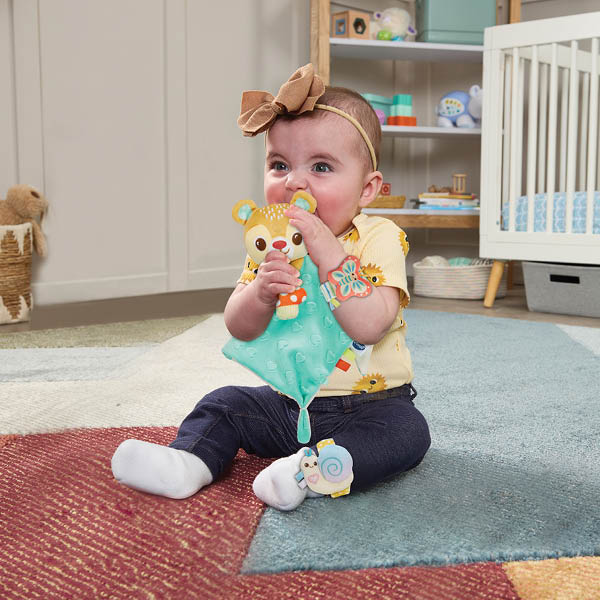Het bewegen en schudden van de bandjes en het knuffeldoekje én het vastpakken van deze speeltjes draagt bij aan de ontwikkeling van de fijne motoriek.