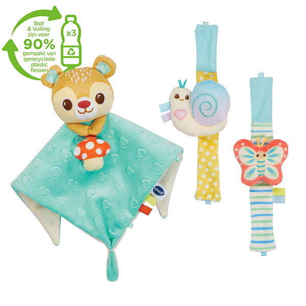 De ideale baby cadeauset met een hoog knuffelgehalte! Bevat een schattig en zacht berenknuffeldoekje met rammelende kraaltjes en 2 bandjes met schattige diertjes die om de polsen of enkels gedragen kunnen worden. De bandjes bevatten een zachte sluiting - zonder klittenband - en het stof is gemaakt van gerecyclede plastic flessen. De zachte stoffen, kleuren, kraaltjes en knisperstof stimuleren zowel de tastzin als de motorische, visuele en auditieve ontwikkeling van kleintjes.