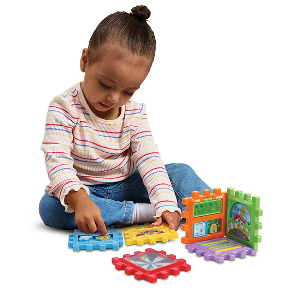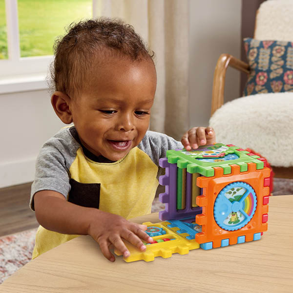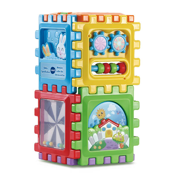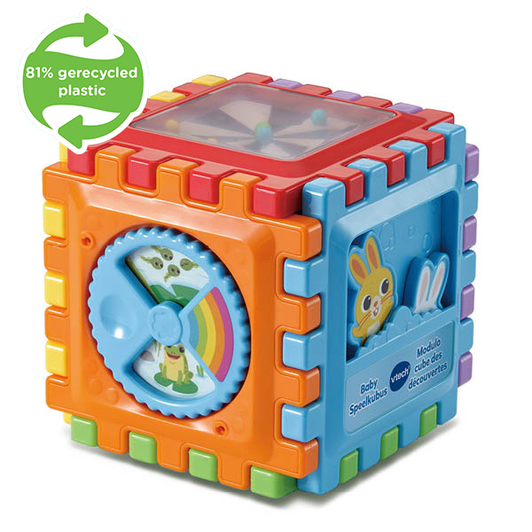 Bouwen, ontdekken en spelen! Ontdek talloze activiteiten met de Baby Speelkubus van VTech®! Beweeg rollers, tandwielen en kraaltjes, ontdek jezelf in het spiegeltje en nog veel meer! Elke kant van deze kubus bevat uitdagende onderdelen en de kubus kan eindeloos in elkaar worden gezet en uit elkaar worden gehaald.