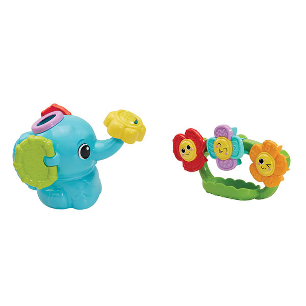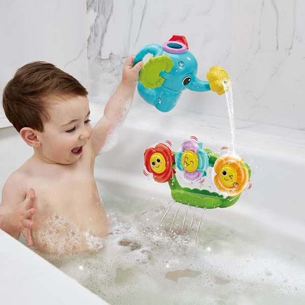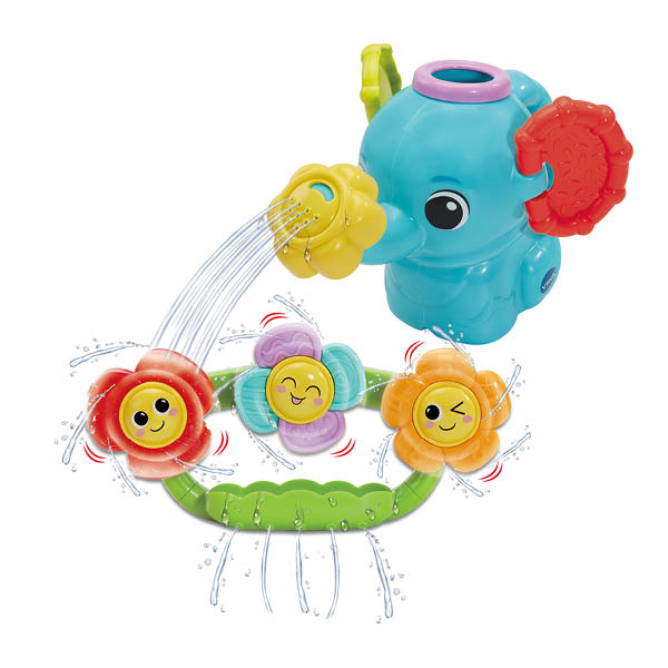 Spetter spater, geef de bloemen water! Vul de schattige olifantengieter met water en kantel de gieter om de kleurrijke bloemen water te geven en zie ze vrolijk ronddraaien! De zuignap aan de achterzijde van de bloemen is eenvoudig te bevestigen aan een bad of badkamerwand. Draai het sproeistuk van de olifant om verschillende waterstromen te creëren voor nog meer spetterend speelplezier. Spetterspat, tijd voor speelpret in bad!