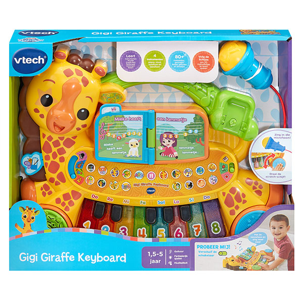 Gigi Giraffe is dol op muziek en zingen, net als jij! Druk op de liedjestoetsen om gezongen liedjes of melodietjes te horen en gebruik de microfoon om mee te zingen.Voeg coole geluiden toe met de scratch-schijf, pas het tempo aan en kies je favoriete instrument (piano, viool, xylofoon of saxofoon). Druk op de knipperende pianotoetsen om de melodietjes mee te spelen of speel een solo. Wow! Het is tijd voor een show!