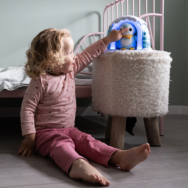 Heerlijk wegdromen onder een magische sterrenhemel! De schattige pinguïn is het ideale knuffelvriendje voor overdag en kan tijdens het bedtijdritueel in zijn iglo worden geplaatst. Het plaatsen van de pinguïn in de iglo activeert het nachtlampje en laat een prachtige projectie op het plafond zien. Stel de tijdklokschakelaar in op 15, 30 of 45 minuten en kies een speelstand om het kleintje heerlijk te laten wegdromen bij klassieke muziek en/of natuurgeluiden.