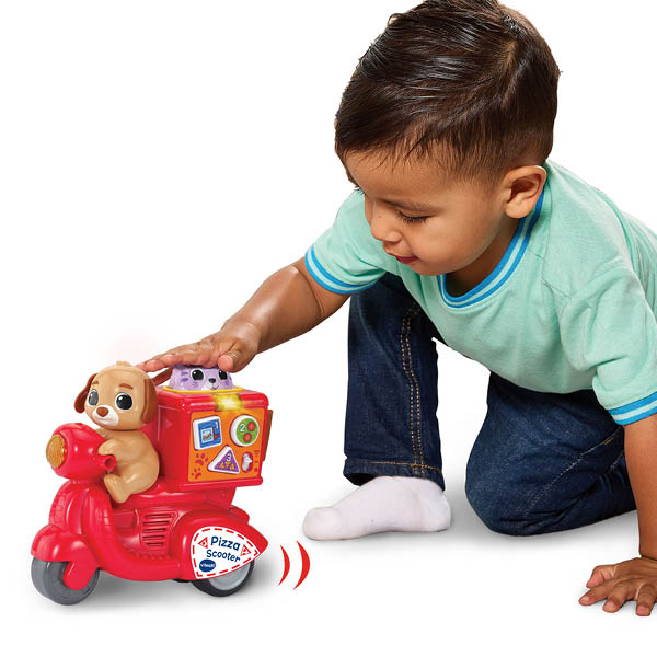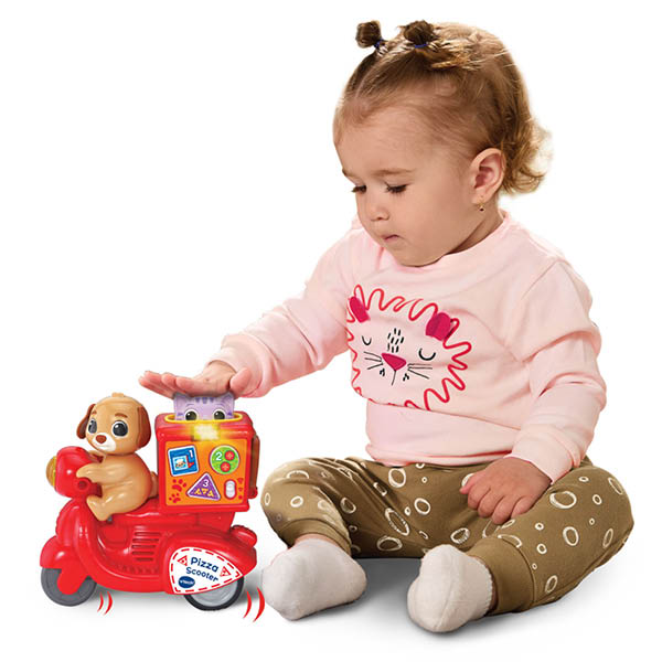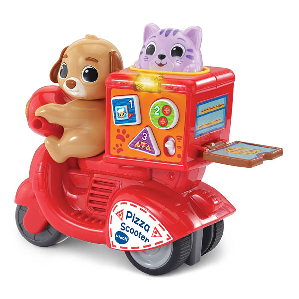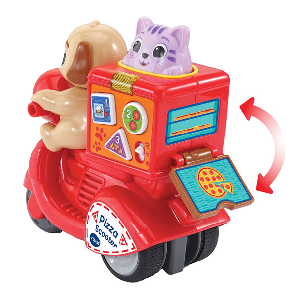 Wie heeft er speelplezier besteld? Deze pizzascooter bezorgt urenlang speelplezier, én pizza's! Druk op de kat om de scooter te laten rijden en druk op de interactieve toetsen om cijfers, vormen, kleuren en meer te ontdekken! Druk en rijd, het is pizzatijd!