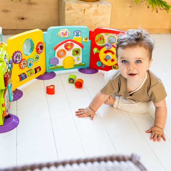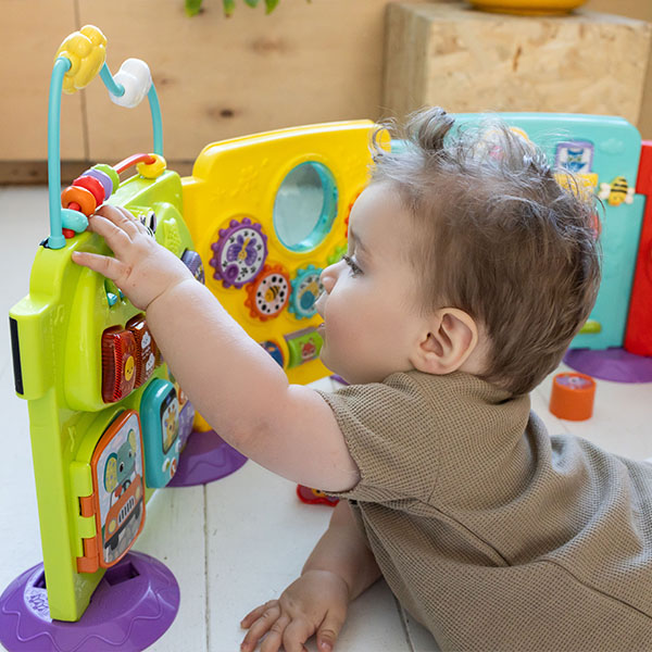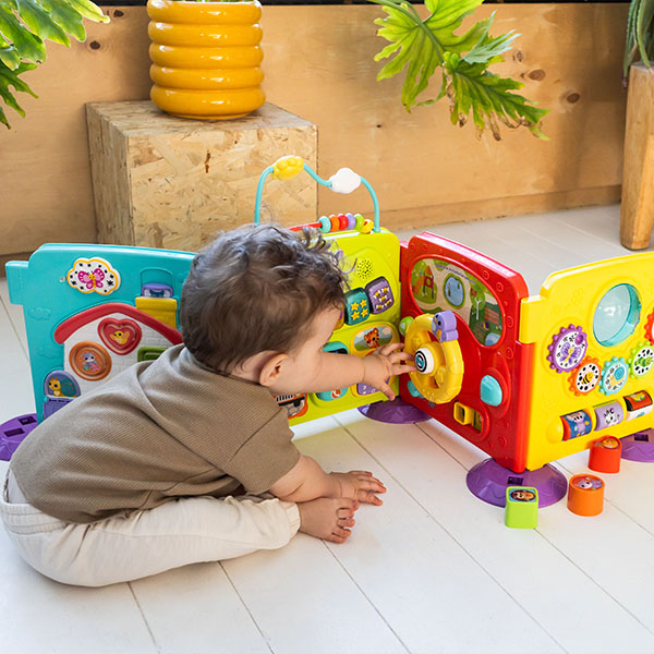 Speel met de losse panelen of verbind ze op verschillende manieren en maak tijdens drie speelstanden kennis met dieren, kleuren, muziek en nog veel meer!