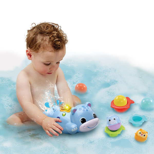 Plaats het nijlpaardje in het water en zie hoe het vanzelf begint te zwemmen en druk op de knipperende ster-toets voor vrolijke reacties. Inclusief 8 badspeeltjes!
