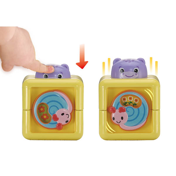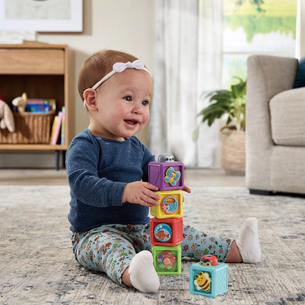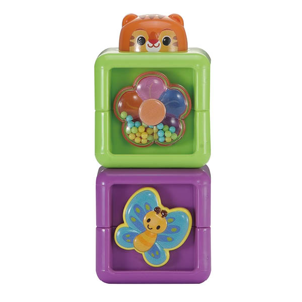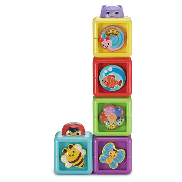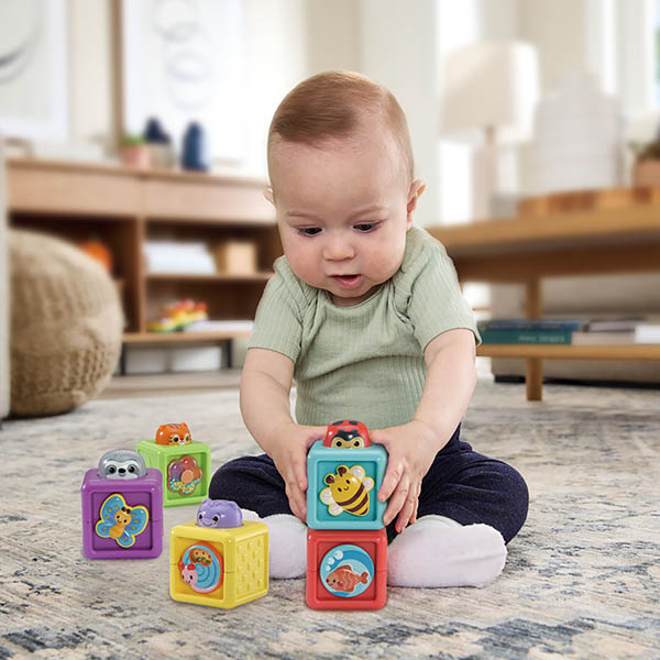Stapelen, ontdekken en spelen! Deze blokkenset bevat 5 kleurrijke blokken met unieke kenmerken die de visuele ontwikkeling, de tastzin en de motorische vaardigheden stimuleren. Druk op een dier om het speelelement te bewegen en ontdek daarnaast cijfers, vormen en texturen. Stapel de blokken op elkaar en druk op het bovenste diertje om een kettingreactie van bewegende elementen te zien!