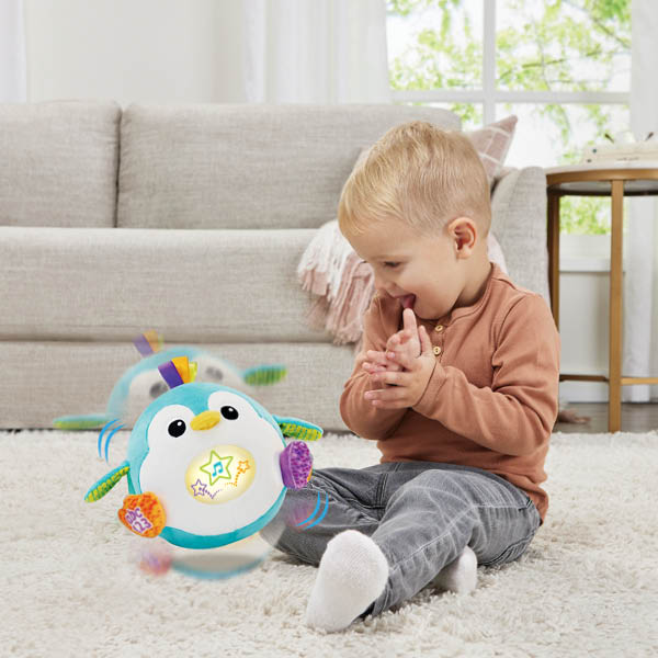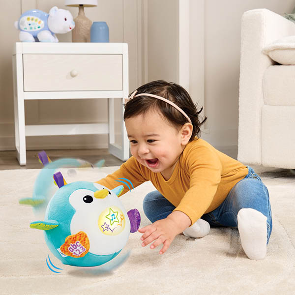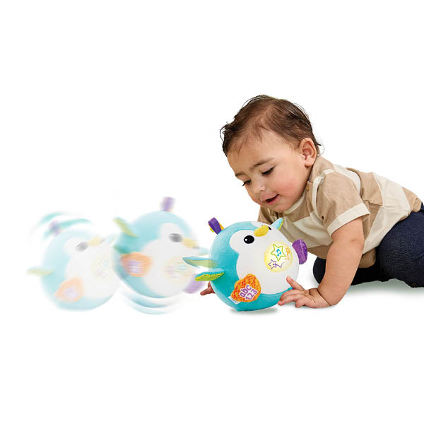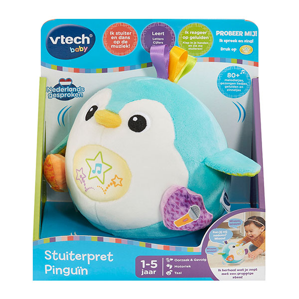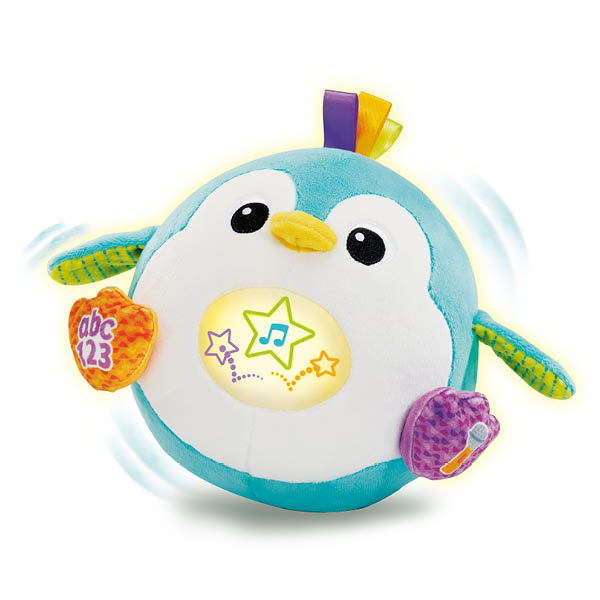 Wiebel, waggel, zing en dans met deze vrolijke, stuiterende pinguïn! Druk op het buikje en luister naar de vrolijke liedjes, melodietjes en zinnetjes en maak geluid om de pinguïn te laten dansen! Druk op de microfoon en doe de pinguïn na om een grappig spelletje te spelen waarbij je stem wordt opgenomen en daarna met een grappig effect wordt afgespeeld. Druk op de ABC-123-toets om kennis te maken met het alfabet en cijfers én een aantal letters en letterklanken. De grappige pinguïn stuitert vrolijk mee op de geluiden en muziek!