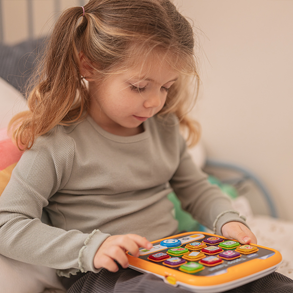 Tijd voor tiptop speelplezier! Speel en leer in het Nederlands óf in het Engels met deze Tiptop Tablet en maak kennis met tellen, het weer, dieren en nog veel meer! Druk op de 12 knipperende toetsen om vrolijke reacties te horen of druk op de cursortoets om mooie lichteffecten te zien. Ga je mee op ontdekking?