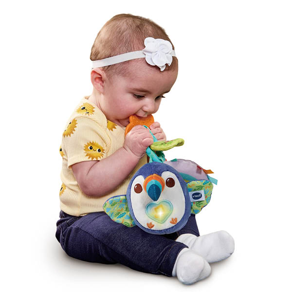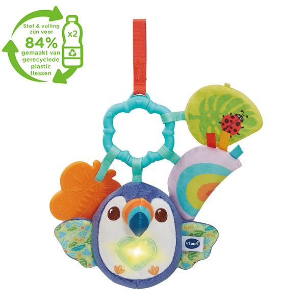 De toekan die overal mee naartoe kan! Hang deze vrolijke toekan aan de kinderwagen of laat je kleintje de verschillende texturen, vrolijke melodietjes en gezongen liedjes ontdekken tijdens het spelen! Maak kennis met kleuren, dieren en muziek terwijl de bijtring de pijn verlicht bij doorkomende tandjes. Onderweg zijn was nog nooit zo leuk!
