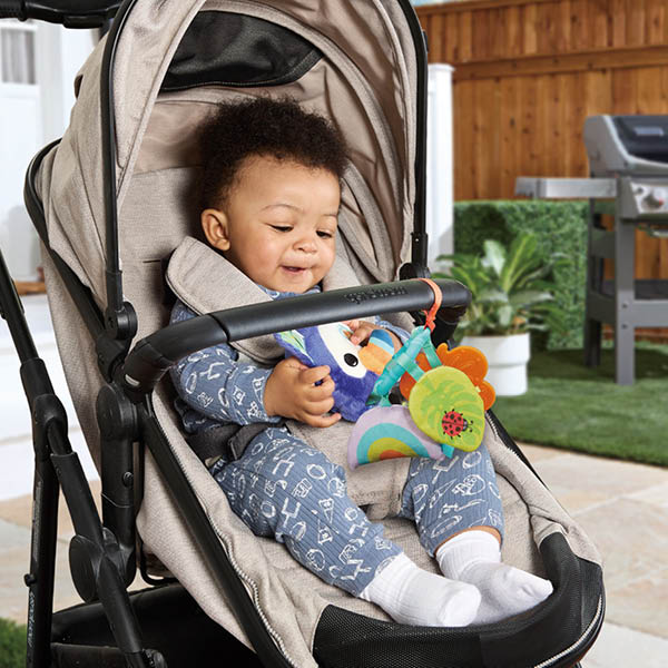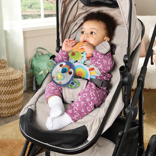 Maak kennis met kleuren, dieren én muziek met deze pluchen toekan die eenvoudig te bevestigen is aan een kinderwagen voor speelplezier onderweg! Inclusief vlinder-bijtring.