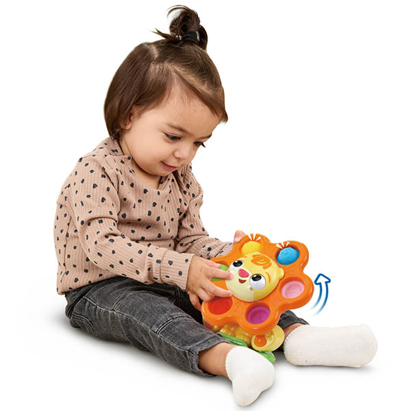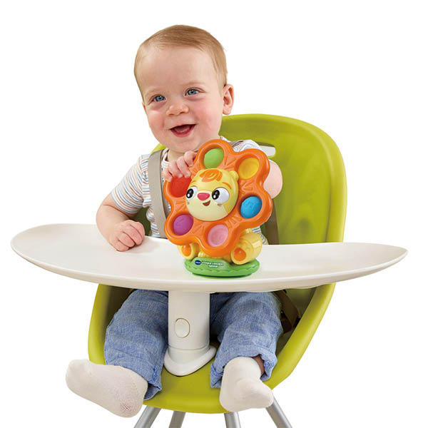 Draaien, drukken, ontdekken en spelen met deze Vrolijke Leeuwen Spinner! Druk op de ploptoetsen, draai de manen in het rond en zie de ogen bewegen! De zuignap zorgt ervoor dat de leeuw stevig op een tafel of kinderstoeltje blijft staan. Tijdens het spelen trainen kleintjes hun fijne motoriek en de plop-toetsen stimuleren de tastzin.